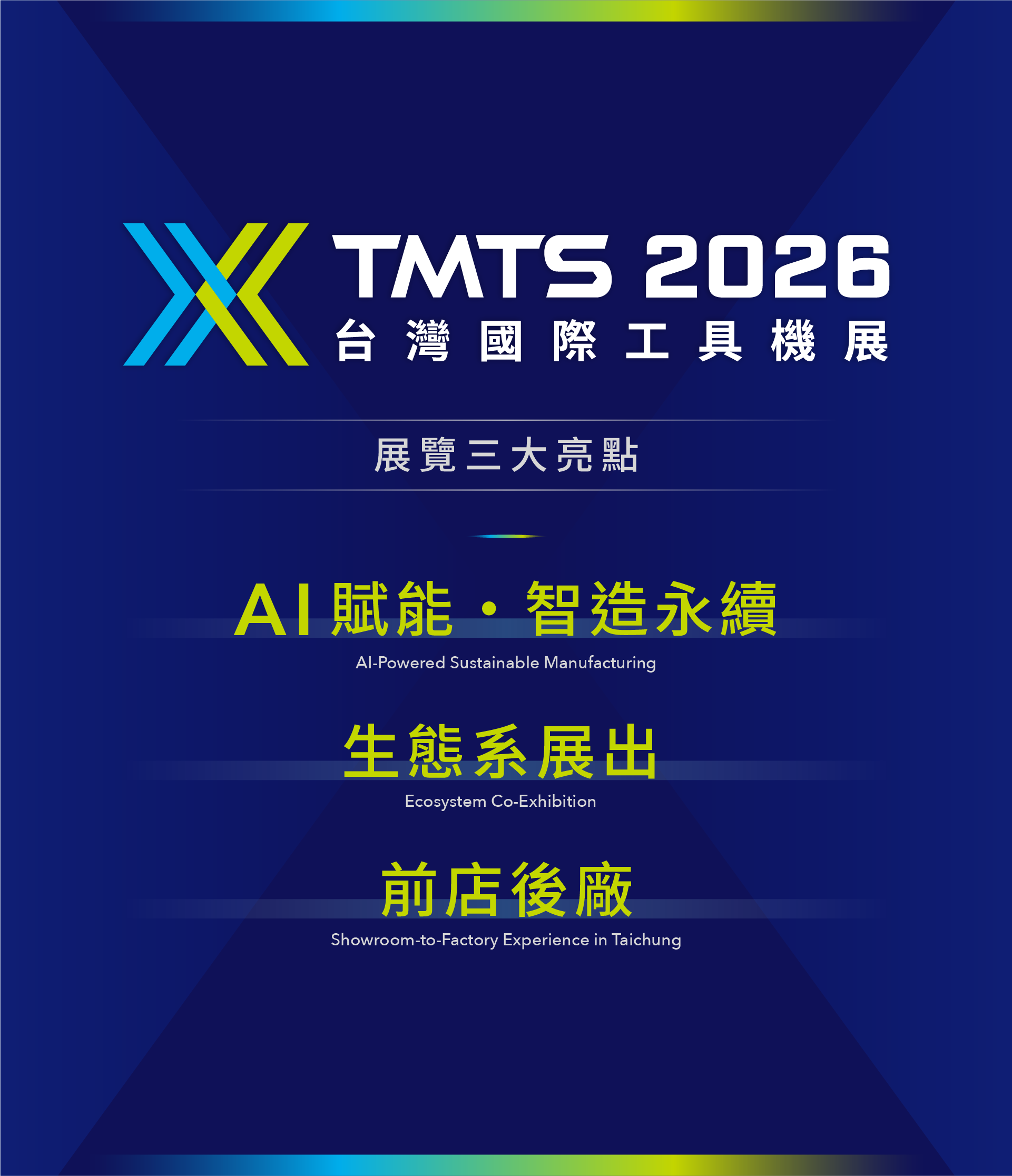 TMTS 2026將於2026 年 3 月 25 至 28 日,在臺中國際會展中心 TICEC盛大登場。本屆展覽主題為 「AI 賦能 智造永續 AI-Powered Sustainable Manufacturing」,聚焦 AI 如何驅動製造業創新及永續發展。TMTS 2026 將展示最新的工具機、智慧製造技術、自動化設備與關鍵零組件,呈現數位化與綠色化整合的新時代解決方案。 臺中作為產業聚落核心,擁有堅實的製造底蘊,TMTS 2026 以「前店後廠」模式串聯展館與工廠,深化買主洽談、技術展示。展覽邁向精緻化、內容導向與生態系整合為策展主軸,強化展覽貼近市場的實質效益。摯邀請您共襄盛舉。