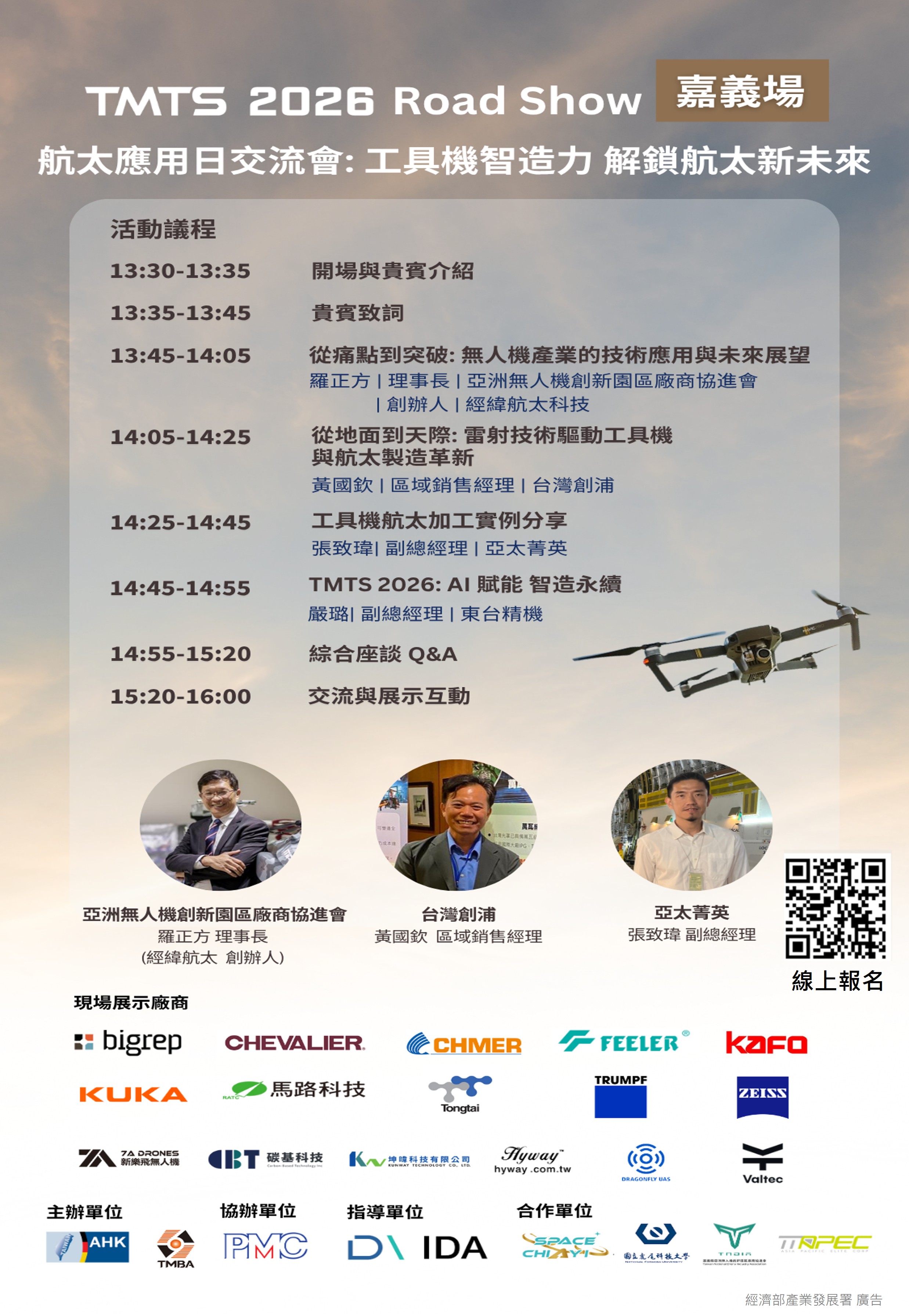 本次活動將前進嘉義《亞洲無人機 AI 創新應用研發中心》,聚焦無人機與航太製造應用,邀請對相關議題感興趣的會員廠商共同參與,一同掌握高階製造的技術脈動與跨域合作的新契機。