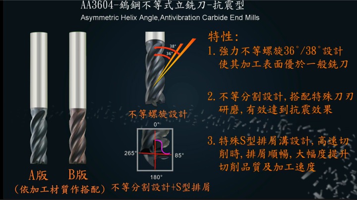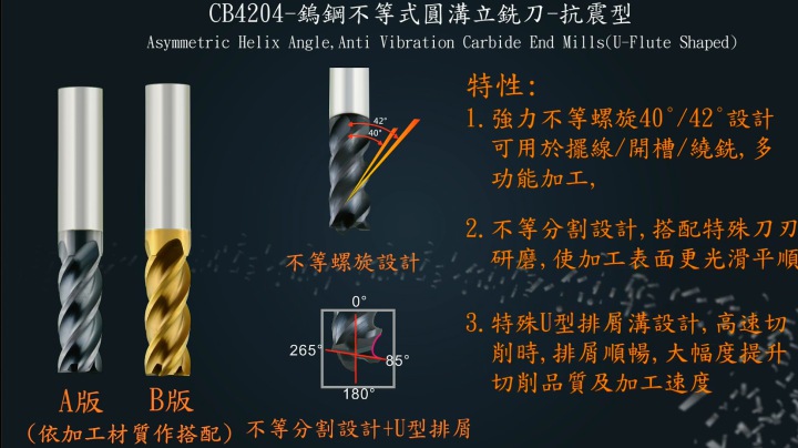 ◆鎢鋼不等式立銑刀(鋁用)-強力不等螺旋44.5º/45º/45.5º 設計,搭配特殊刀刃研磨,加工時不易震刀,使其表面粗糙度極佳,有效減少切削時的震動,增加刀具穩定性。